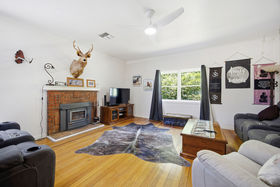 The residence features a spacious living area with wood heater & split system, complemented by a separate kitchen and dining zone complete with a walk-in pantry and excellent storage, including attic space. The practical floorplan comprises three bedrooms with built-in robes, including one with a split system, a central bathroom with bath, a separate toilet, and a generously sized, updated laundry.